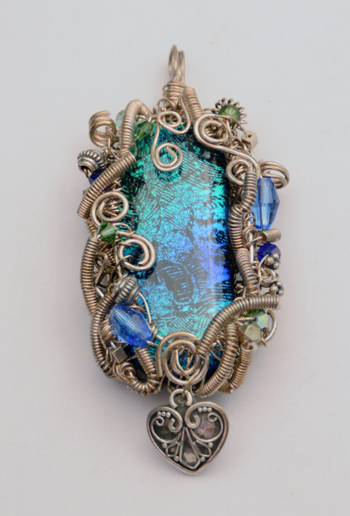 For the last day I bring you something truly unusual. The center of this pendant is a very large (seriously, honking big) dichroic glass cabochon with an intricate pattern. After making the cabochon, I created a basic frame with silver wire that also created the bail. Then—attached to the base frame—are multiple coiled and twisted wires along with a few beads—silver and Swarovski crystal—and a small, heart-shaped charm dangling from the bottom. This whole thing has a vaguely steampunky look.