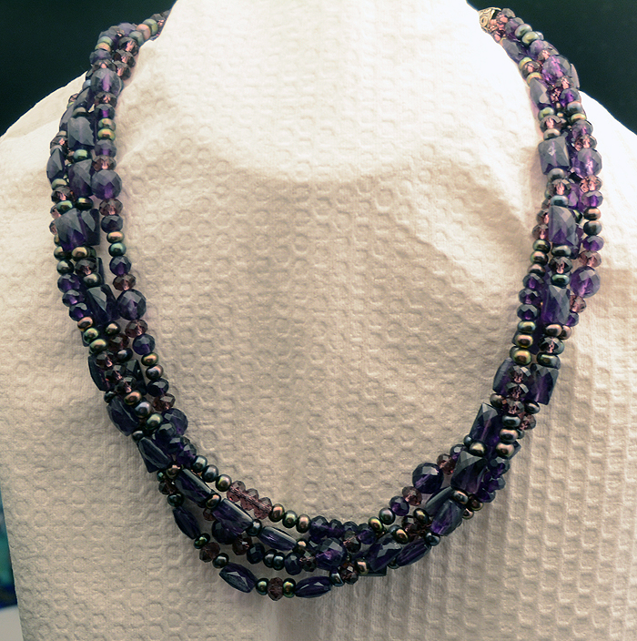Anyway, today I am giving away the necklace for all fans of the color purple! Stunning amethysts in multiple cuts, combined with Swarovski crystals and irradiated cushion pearls, this multi-strand necklace is medium-length and has a Bali sterling clasp.
